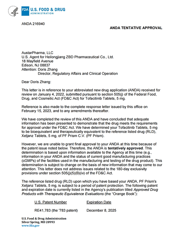 5月26日,珍寶島藥業(yè)發(fā)布公告,公司收到美國食品藥品監(jiān)督管理局(簡稱“美國FDA”)的通知,珍寶島藥業(yè)向美國FDA申報(bào)的枸櫞酸托法替布片的新藥簡略申請(ANDA,即美國仿制藥申請)已獲得暫時(shí)批準(zhǔn)(暫時(shí)批準(zhǔn):指FDA已經(jīng)完成仿制藥的所有審評(píng)要求,但由于專利權(quán)或?qū)Yu權(quán)未到期而給予的一種批準(zhǔn)形式)。